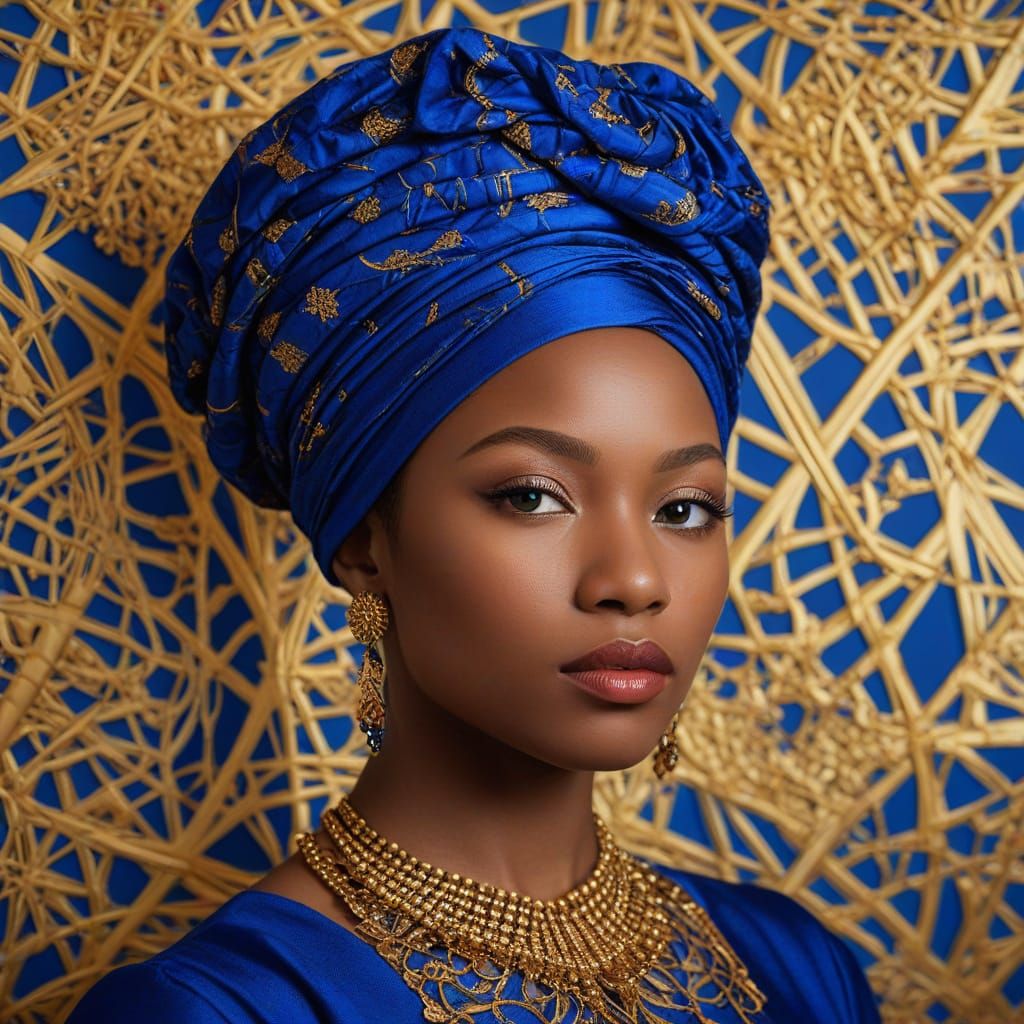 A close-up portrait of a Black woman dressed in intricately patterned, textured fabrics, set against a vibrant, multicolored background with swirling patterns and dramatic lighting.