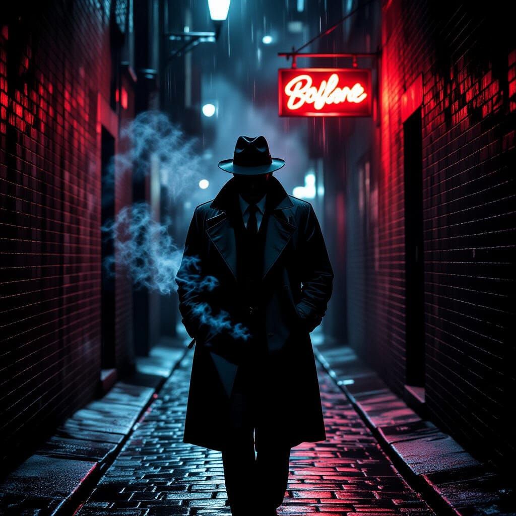 A lone detective stands in a dark, wet alley under a flickering neon sign. This cinematic image features dramatic lighting, film grain and a desaturated color palette.