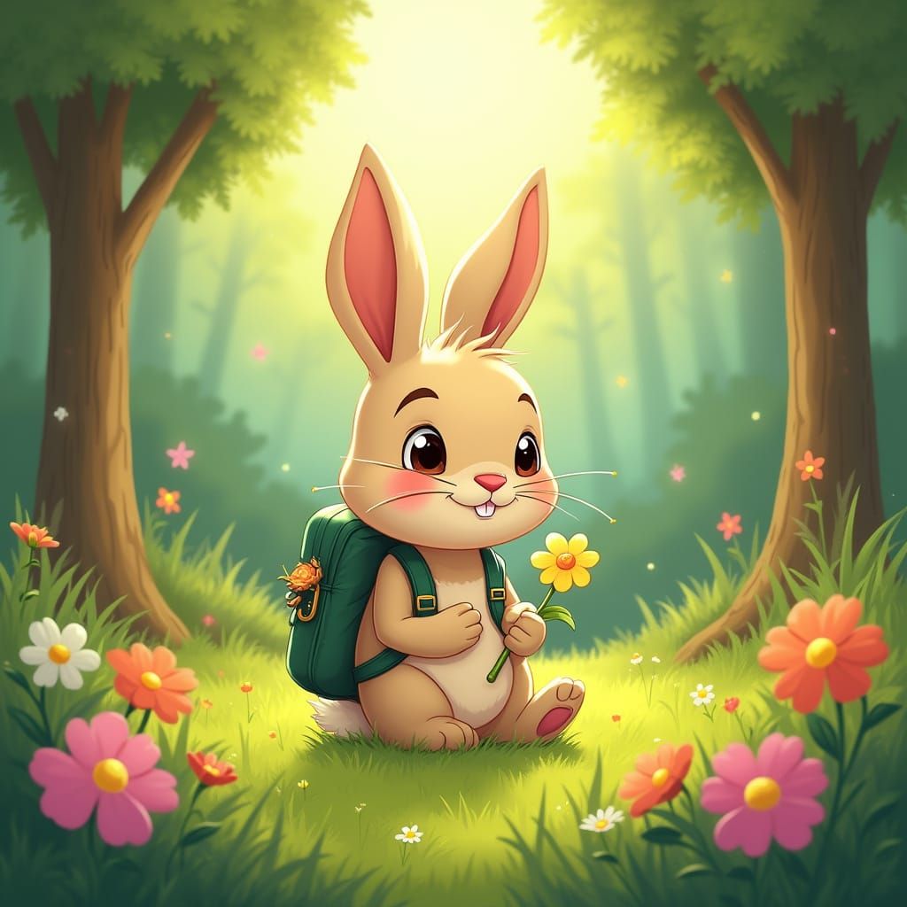 This image features a gentle rabbit in a lush forest, surrounded by colorful flowers, with a warm and inviting atmosphere, reminiscent of classic Disney animation.
