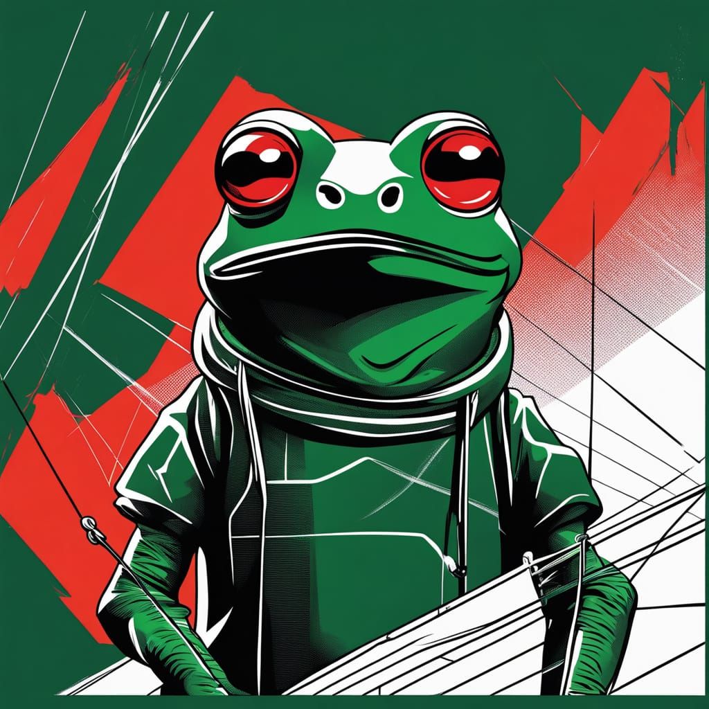 A high-contrast, streetwear-style T-shirt illustration of a dark green frog character with a stark white outline, meticulously rendered in a retro cartoon aesthetic.