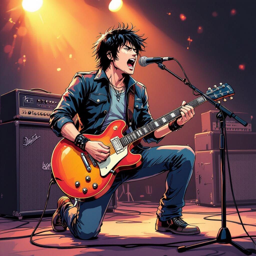 This image features a vibrant, manga-style drawing of a rock guitarist singing into a floor microphone. The energetic scene highlights his amplifier and guitar with bold shading and dramatic linework, reminiscent of classic Japanese animation.