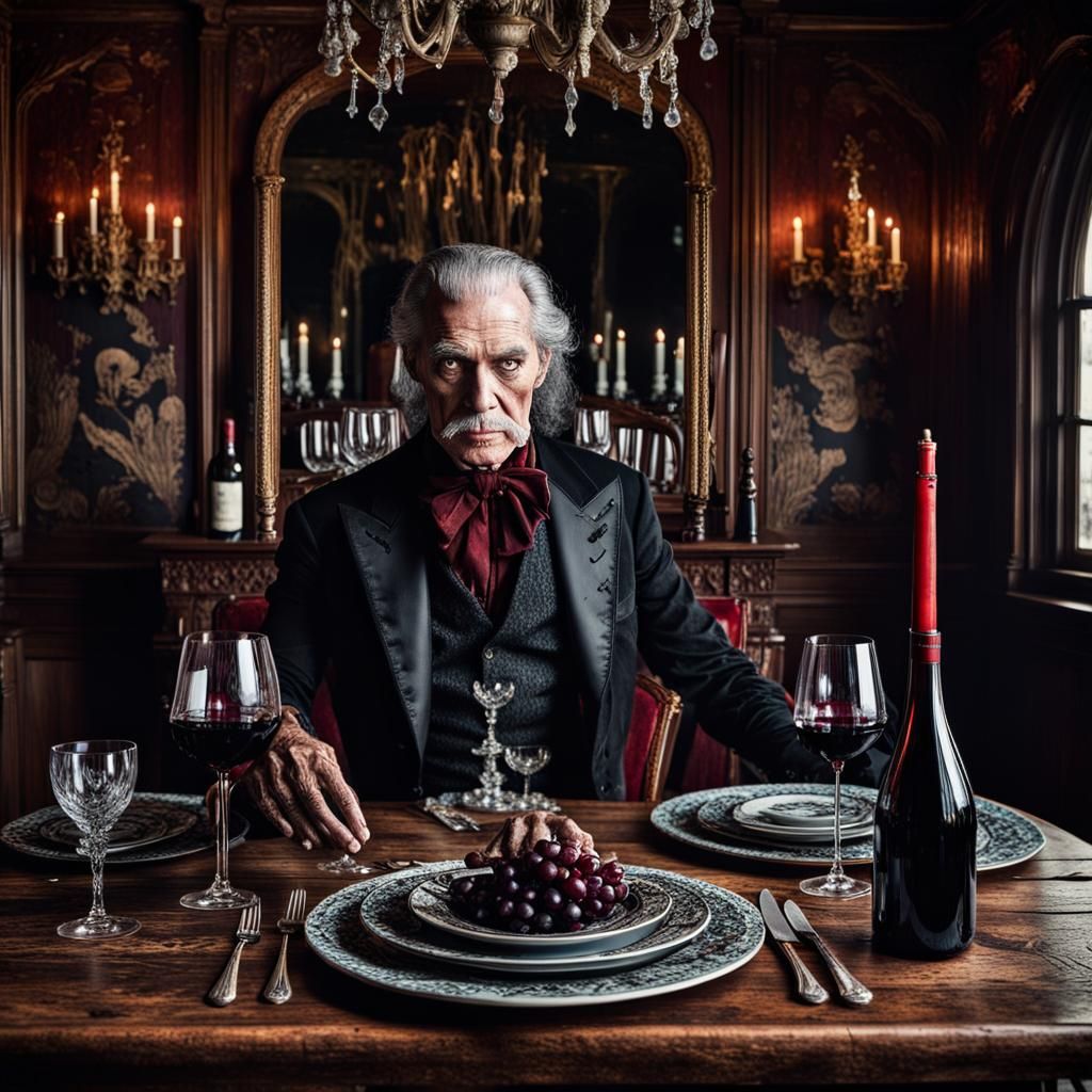 This image depicts a supermodel vampire in a gothic dining room, holding wine glasses with a tipsy expression. Features ornate attire and holographic hues.