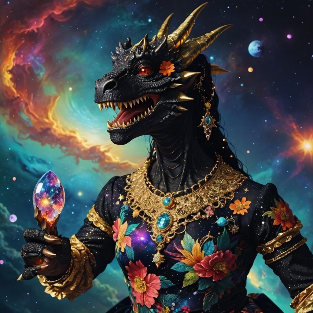 A surreal digital artwork featuring a magical stone wand and rich rock textures. The image evokes cosmic dreams and fantastical creatures in a psychedelic style, rendered in high detail.