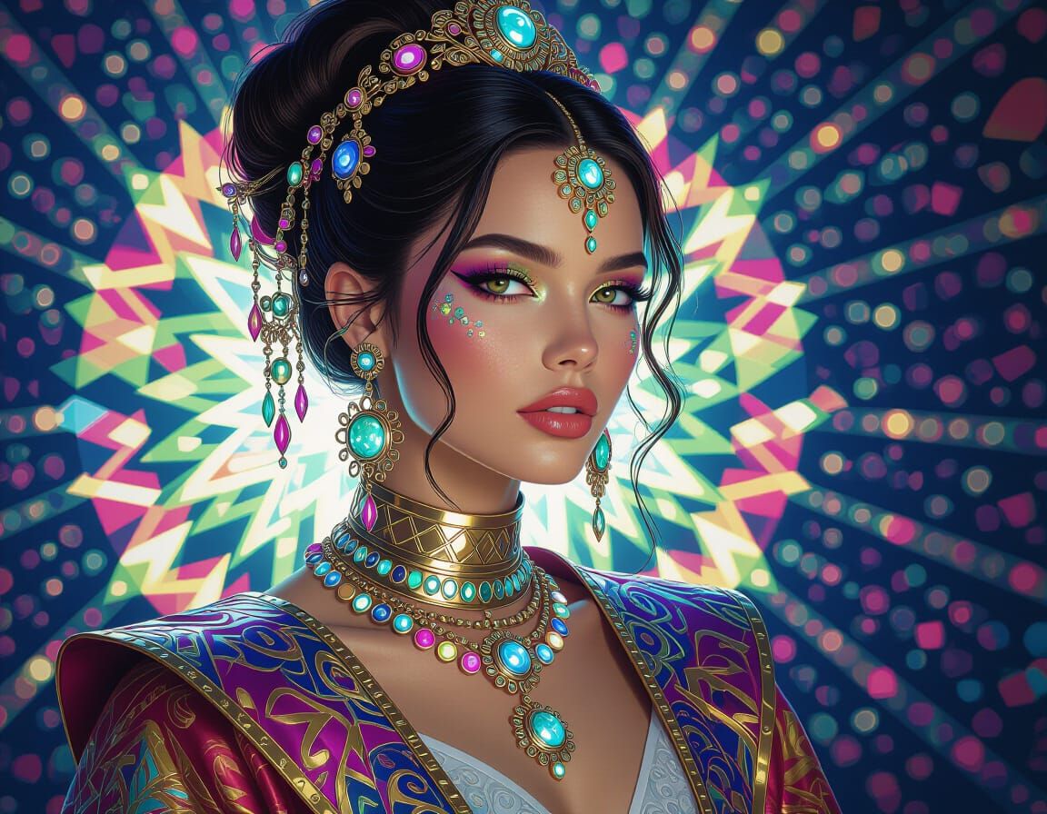 This image shows a woman in vibrant clothing and futuristic jewelry. The detailed concept art features iridescent fabrics, metallic accents, and a kaleidoscopic background with dramatic lighting.