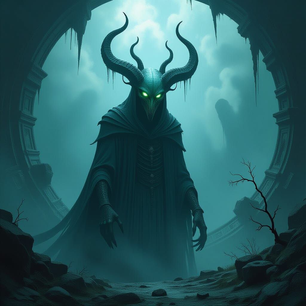 This image shows a terrifying, demonic alien creature in a dark, mystical realm. The otherworldly atmosphere evokes a dark fantasy aesthetic.