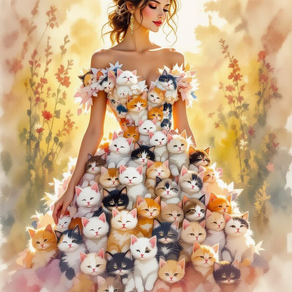 Generate your own AI images of women in dresses made of cats, in a beautiful watercolor style. It's free and easy!