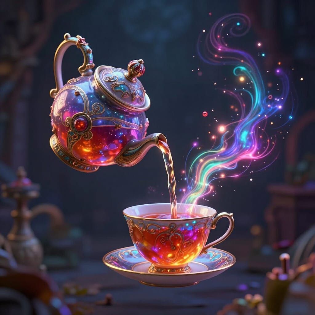 This hyperrealistic image shows an anthropomorphic teapot magically pouring colorful tea into a cup, surrounded by glowing stardust. Rendered with volumetric lighting and a captivating palette.