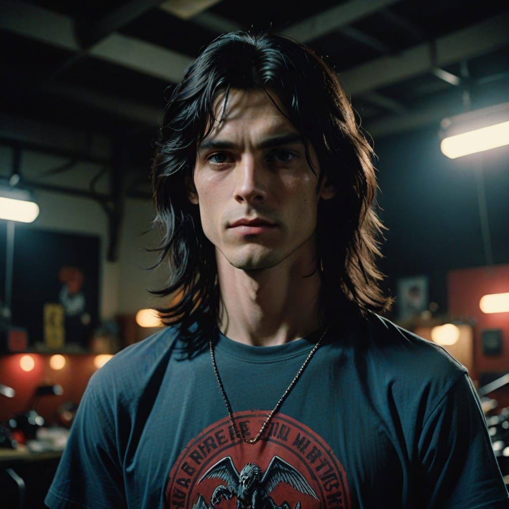 A pale young man with jet black hair and sharp features stands out in a 1980's rock band setting, surrounded by cinematic lighting and atmospheric colors.