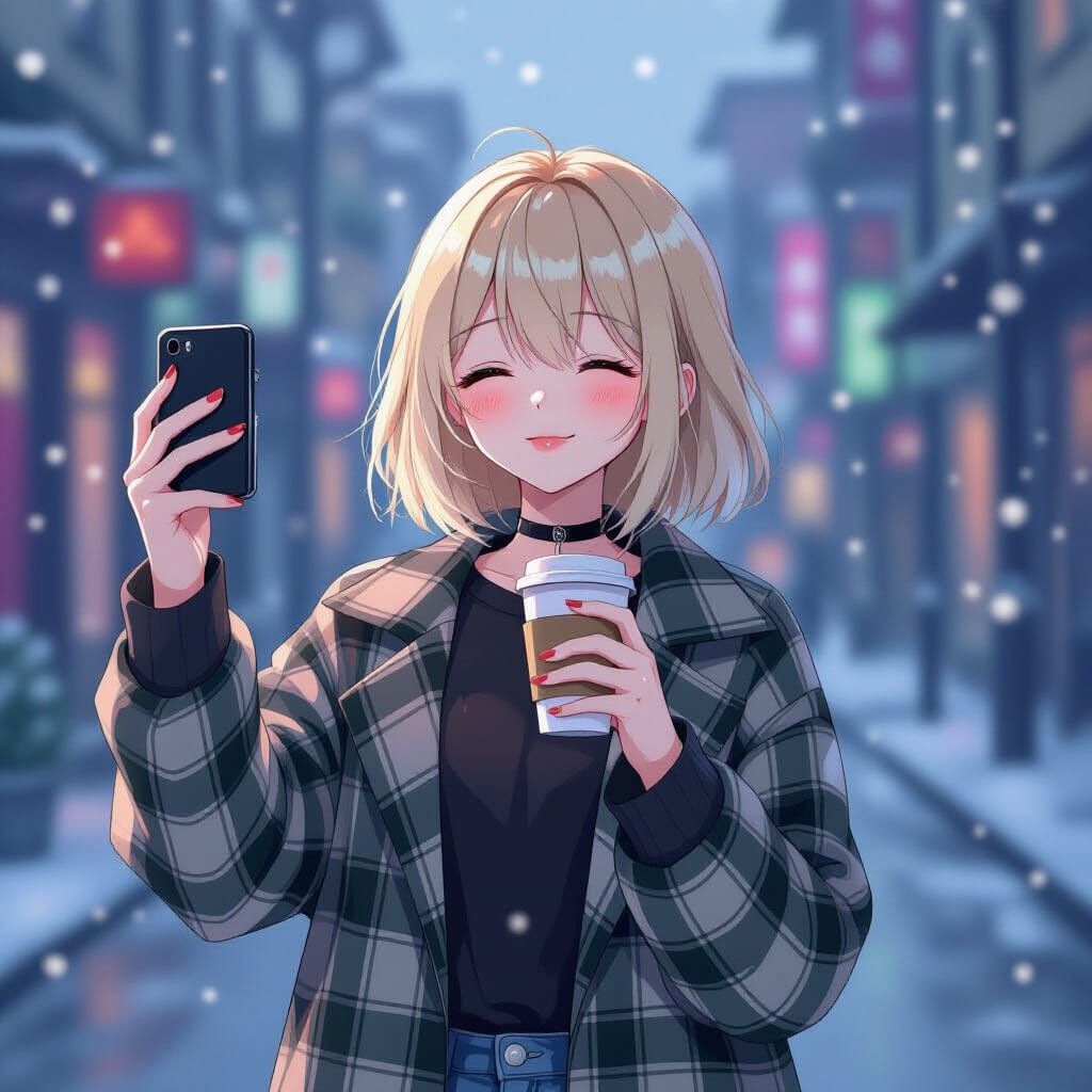 This image shows an anime girl with blonde bob hair and plaid jacket, holding coffee on a snowy street. Features a flat, drawn art style with pistachio and pink colors, and cinematic lighting.
