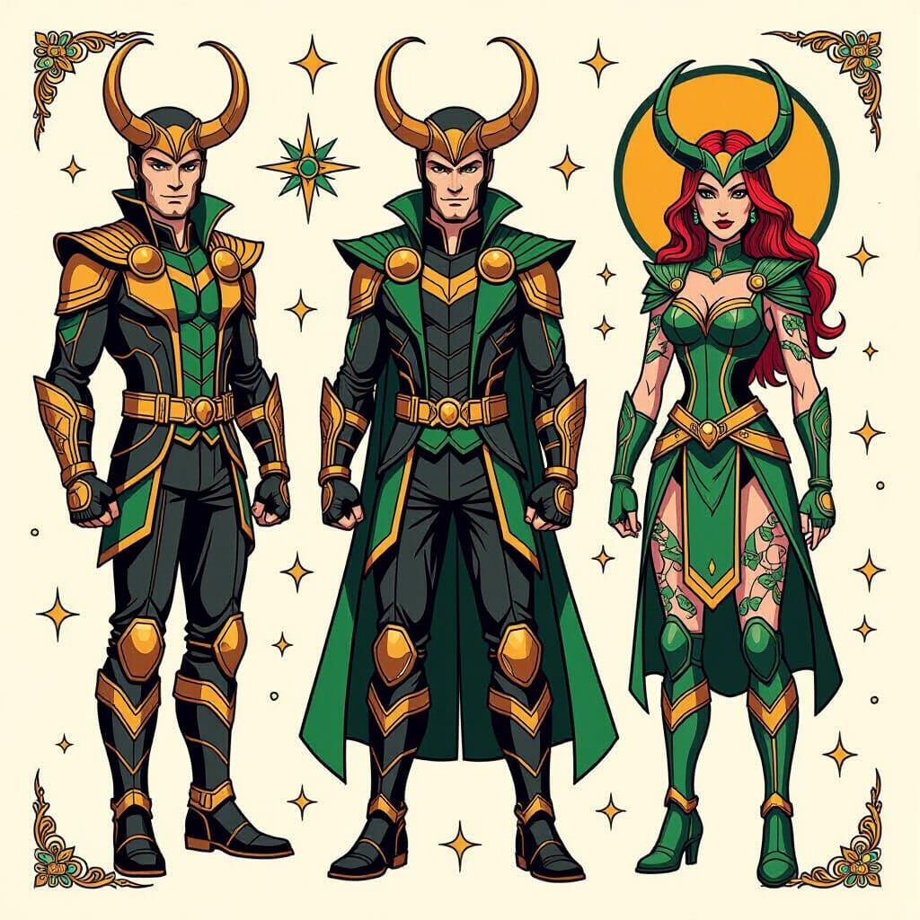 This image shows a tattoo sheet filled with vibrant Marvel action figures, including male and female Loki. The symmetrical designs feature bold lines, bright colors, and dynamic compositions, reminiscent of tattoo shop art.