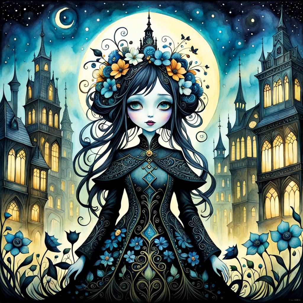 A whimsical image of five flower friends against a detailed city backdrop. The art style evokes a blend of watercolor and ink techniques, with surreal and intricate details in complementary colors.