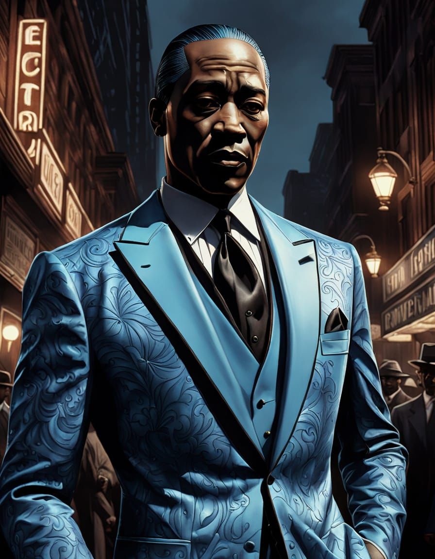 A highly detailed, monochromatic illustration of a transformation scene, set in a dark, luxurious atmosphere with deep shadows and sharp lighting, featuring a stylized, exaggerated figure in a baby blue tuxedo, surrounded by intricate patterns and textures.