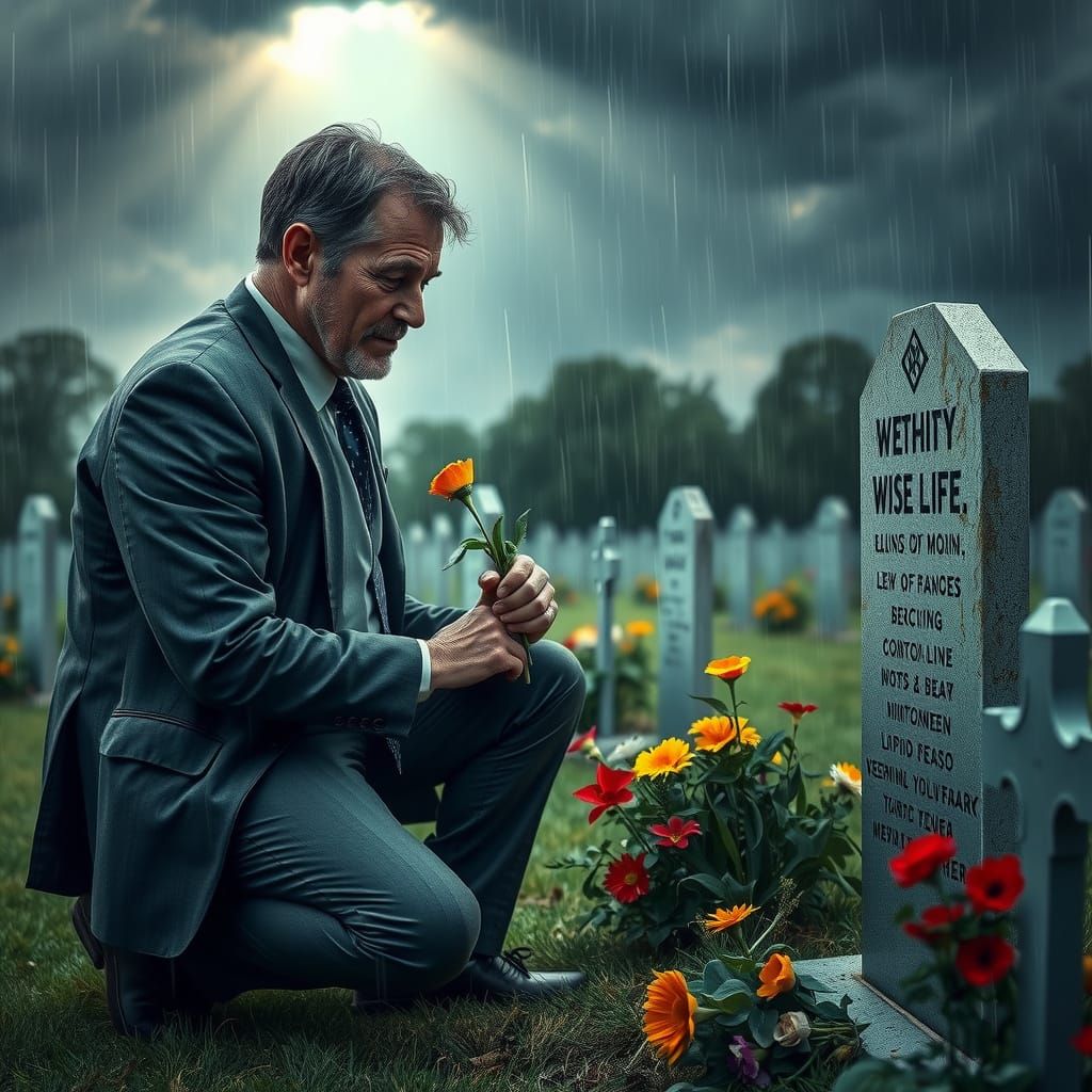This image captures a grief-stricken man kneeling at his wife's flower-covered grave in a veteran cemetery. Sunlight pierces through rain clouds, enhancing the melancholic, cinematic atmosphere with dramatic lighting and expressive brushstrokes.