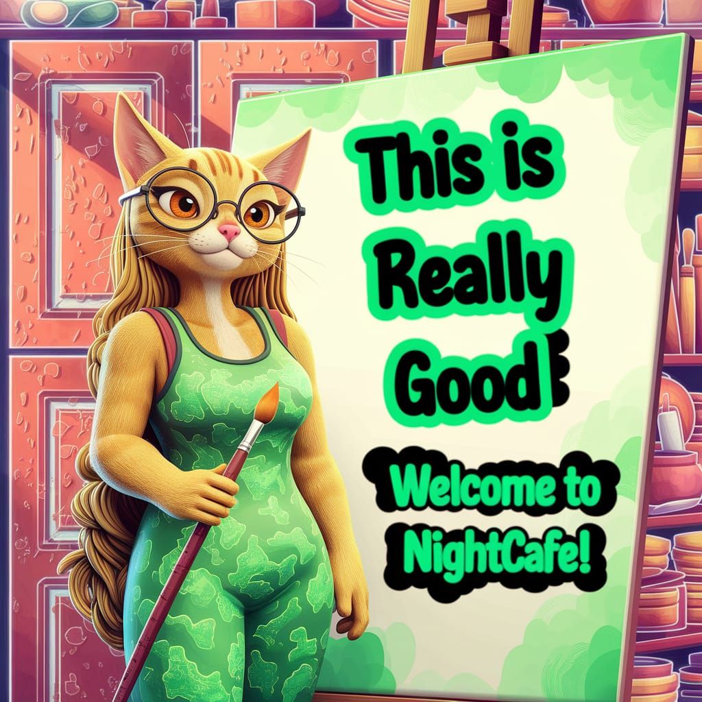 In a warmly lit art studio filled with scattered paint supplies and shelves brimming with art materials, a charming anthropomorphic female cat with long blonde hair, Amber eyes, wearing glasses, stands gracefully in front of an easel. She holds a paintbrush delicately in her paw, her expression one of ...