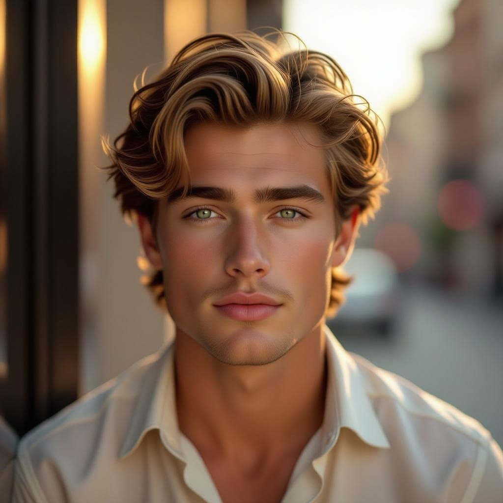 A photorealistic portrait of a serene young man with golden blonde hair and captivating green eyes, exuding effortless sophistication and angelic presence, reminiscent of high-end digital art trends and cinematic lighting.