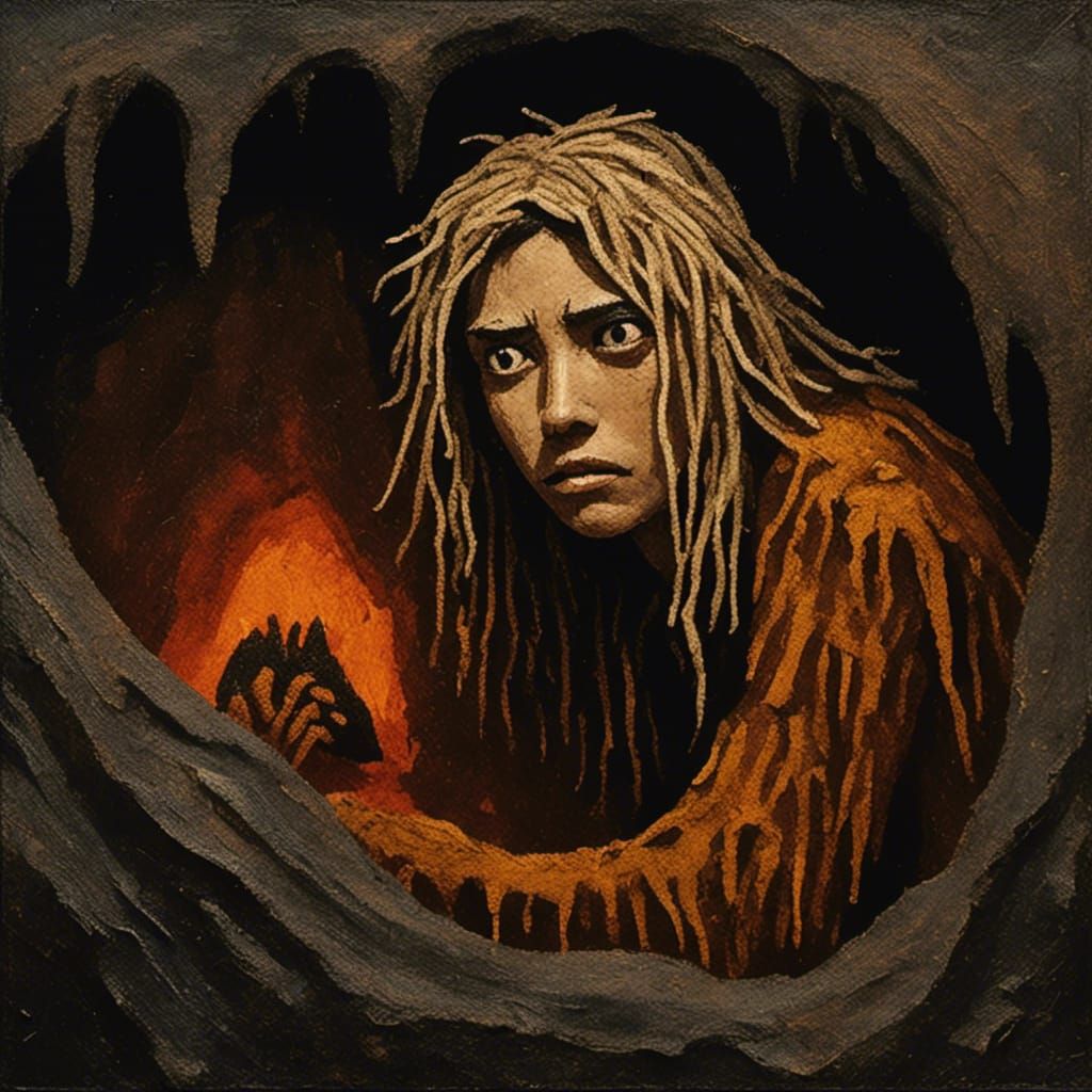 A chilling close-up of a disheveled woman in a dimly lit cave, depicted with a black eye and animalistic features. This horrorcore image uses vivid colors and oil painting techniques to create a haunting, hyper-realistic scene.