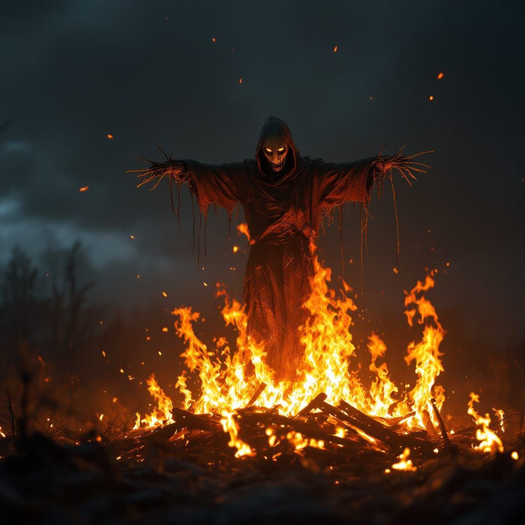 A chilling image of a scarecrow engulfed in flames against a dark sky. The bonfire illuminates the scene with intense, golden-orange hues, rendered with detailed textures and volumetric lighting in a gothic style.