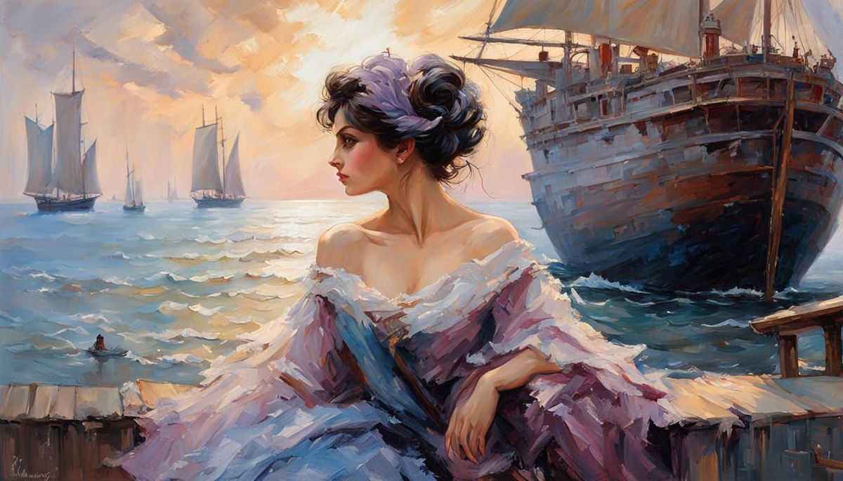 This image features a beautiful anime woman with ships in the background, rendered with thick, textured impasto brushstrokes in muted, earthy tones. Gouache and oil painting techniques create a three-dimensional effect.