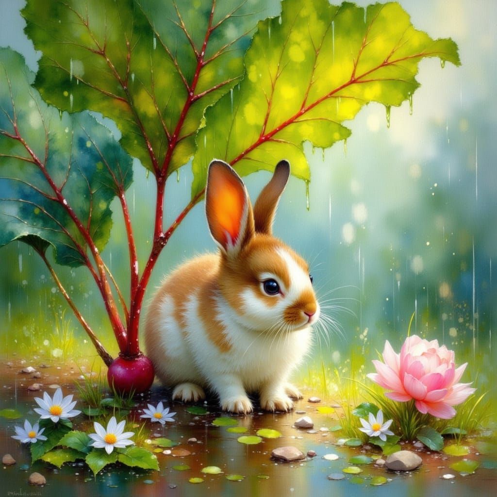 This image shows a tiny, scared rabbit seeking shelter from the rain under a large rhubarb leaf. The scene is depicted with dappled sunlight, summer flowers, and vibrant pastel colors in an ethereal impressionistic style.