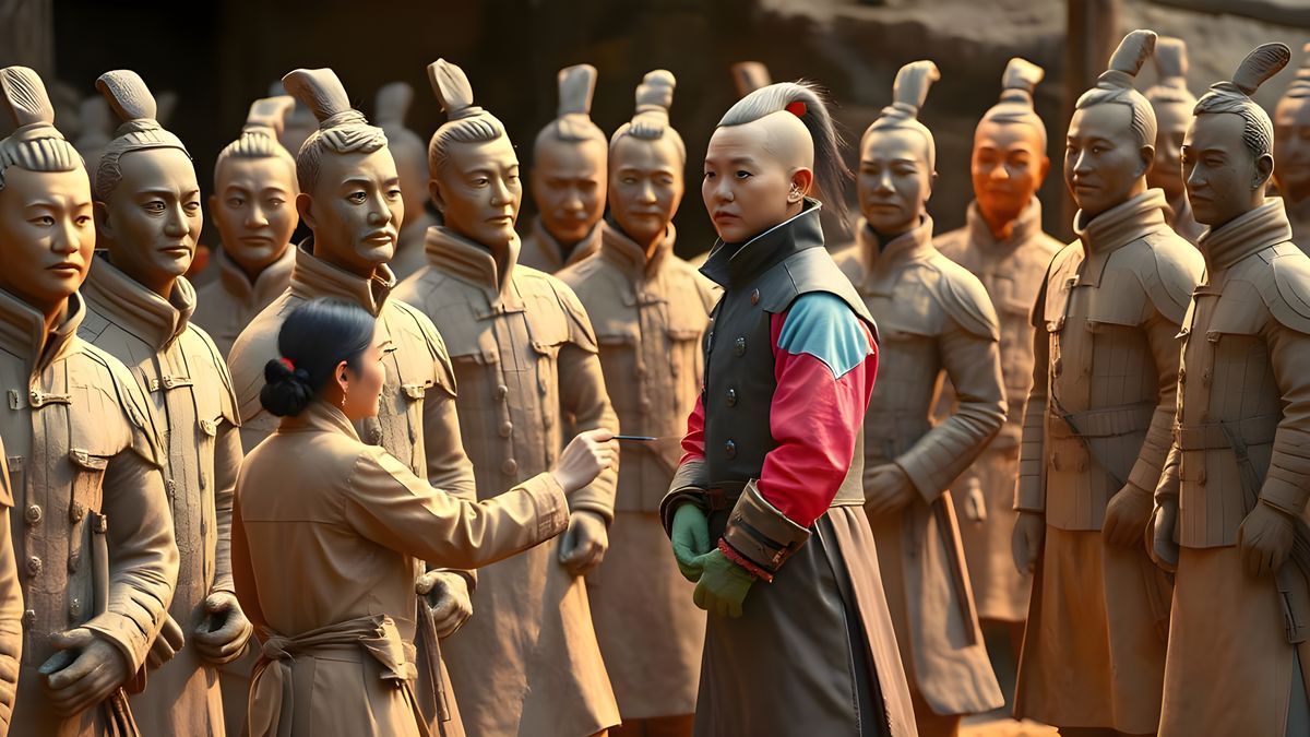 This image showcases intricately detailed terracotta soldiers in formation, with one restored to vibrant colors in a striking contrast to the earthy tones of the surrounding figures, evoking the organic style of traditional ceramics and hyper-realistic details reminiscent of meticulous paintings.