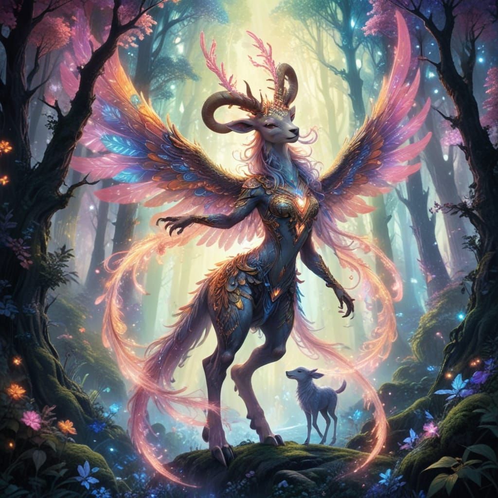 This image depicts a celestial humanoid cryptid with horns, wings, and hooves in a mystical forest. It features ornate lineart and vivid colors, with a glowing aura, in a richly detailed fantasy art style.