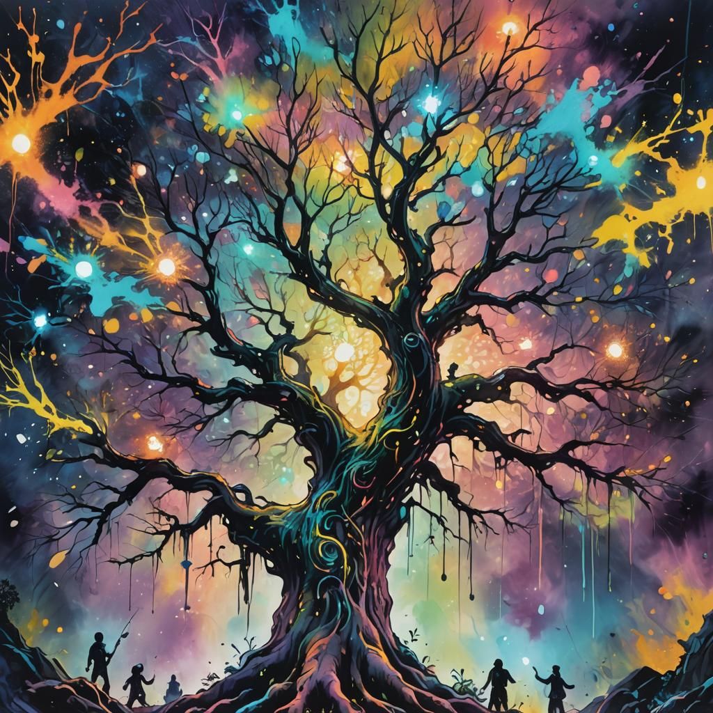 A vibrant painting of the Tree of Souls from Avatar, guarded by glowing spirits. The image features luminous colors, lush vegetation, and soft lighting to create a mystical, ethereal ambiance.