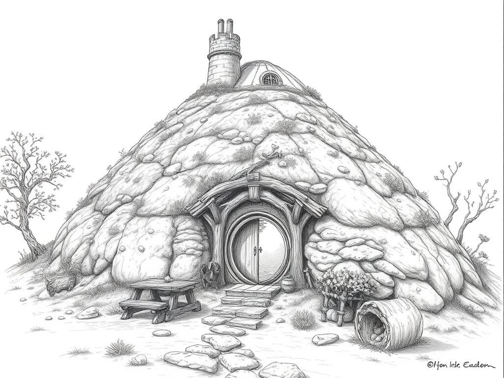 This image depicts a serene hobbit home nestled within an earthen mound, evoking a mystical atmosphere reminiscent of mythological tales.