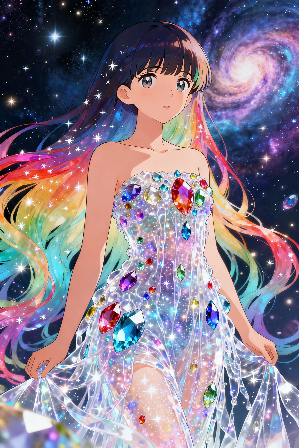 This image features a young woman with flowing rainbow hair and a gemstone-adorned dress, composed entirely of stardust. The background is a shimmering nebula with ethereal light, in a vibrant anime style.