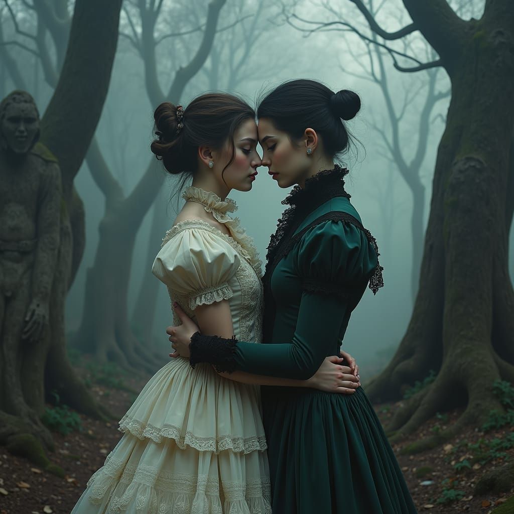A captivating image of friends embracing in a misty forest. The scene features crumbling statues and gnarled trees, with the subjects adorned in intricate Victorian clothing, rendered with a dark, dreamlike aesthetic.