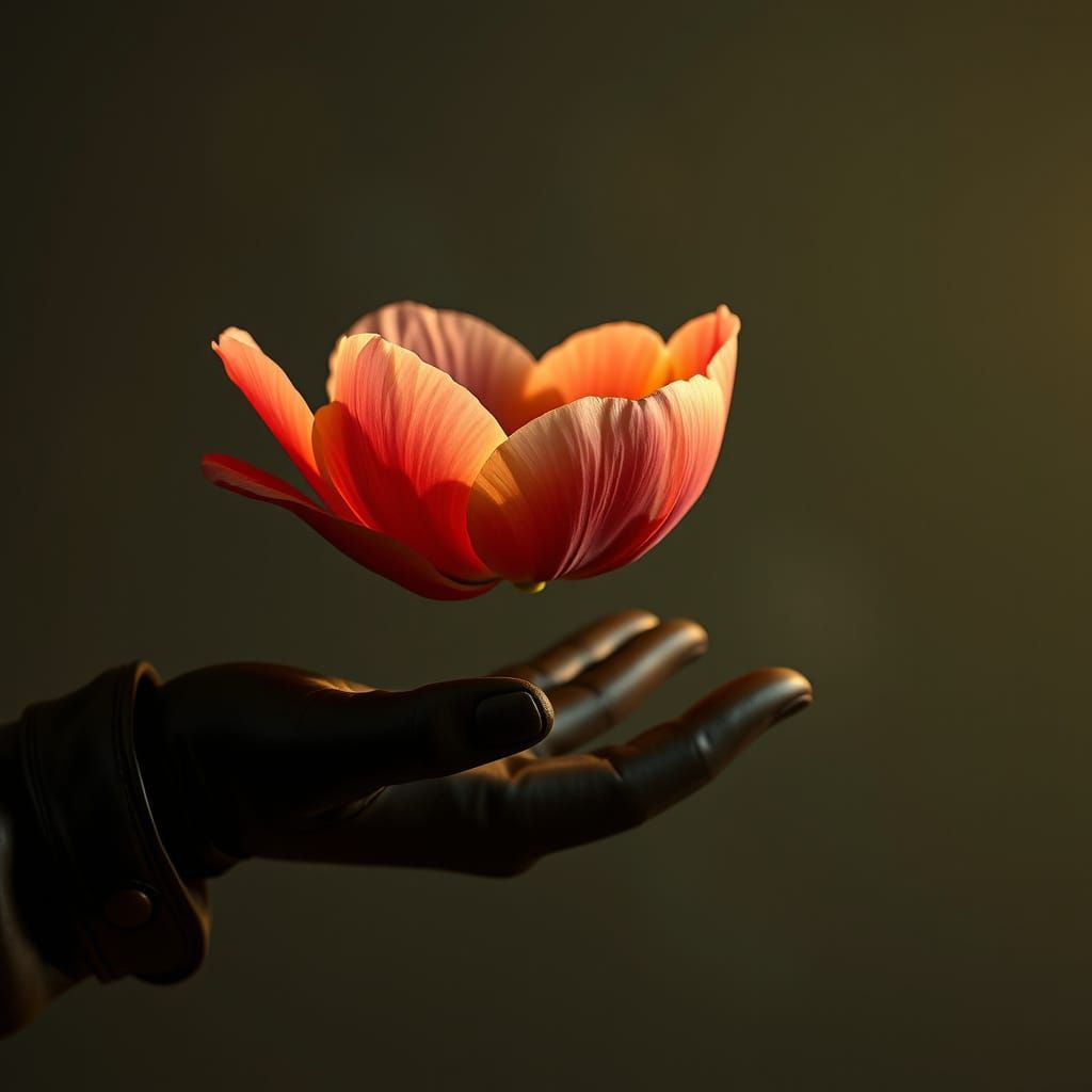This image showcases a delicate peony petal floating in mid-air, about to settle into a Victorian-inspired leather-gloved hand. The scene is bathed in dynamic, high-end lighting with vibrant colors and deep shadows, reminiscent of Art Nouveau and Unreal Engine 5-level volumetric lighting.