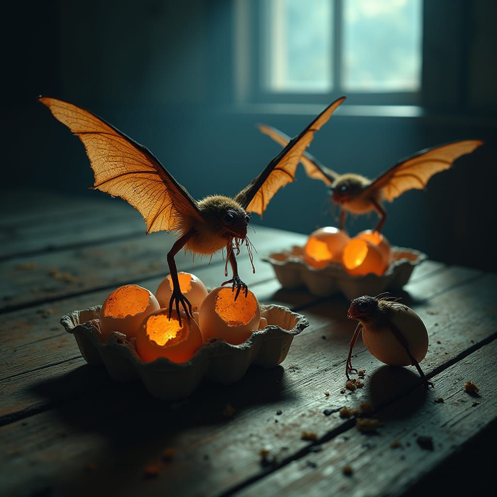 A haunting image of a weathered table, illuminated by soft blue-hour light, with a shattered egg carton and three hatched, bat-like creatures, showcasing hyper-realistic, cinematic detail and eerie atmosphere
