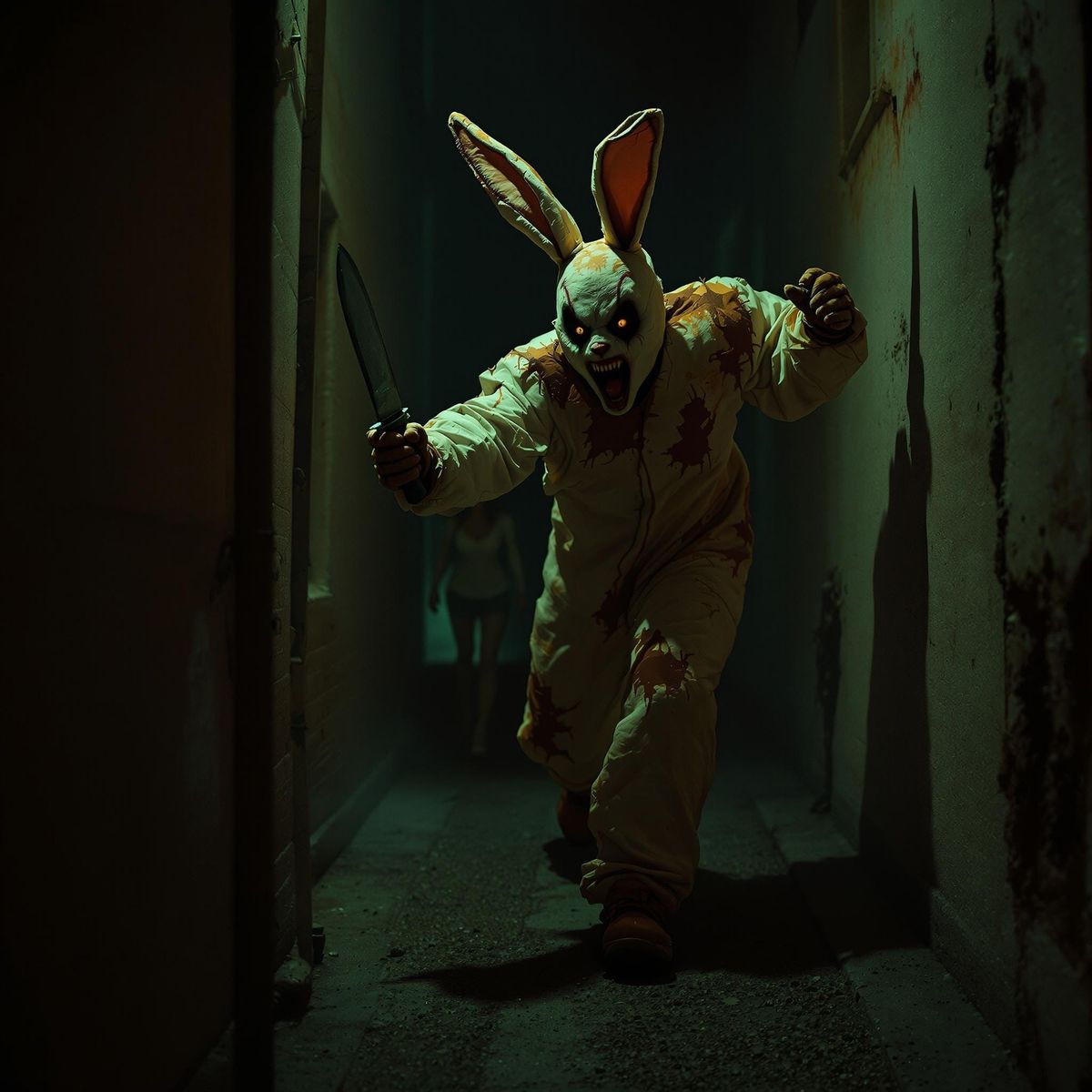 A haunting image of a woman fleeing a menacing figure in a tattered rabbit costume, shot in a cinematic style with warm tones and subtle film grain, evoking a sense of suspense and tension.