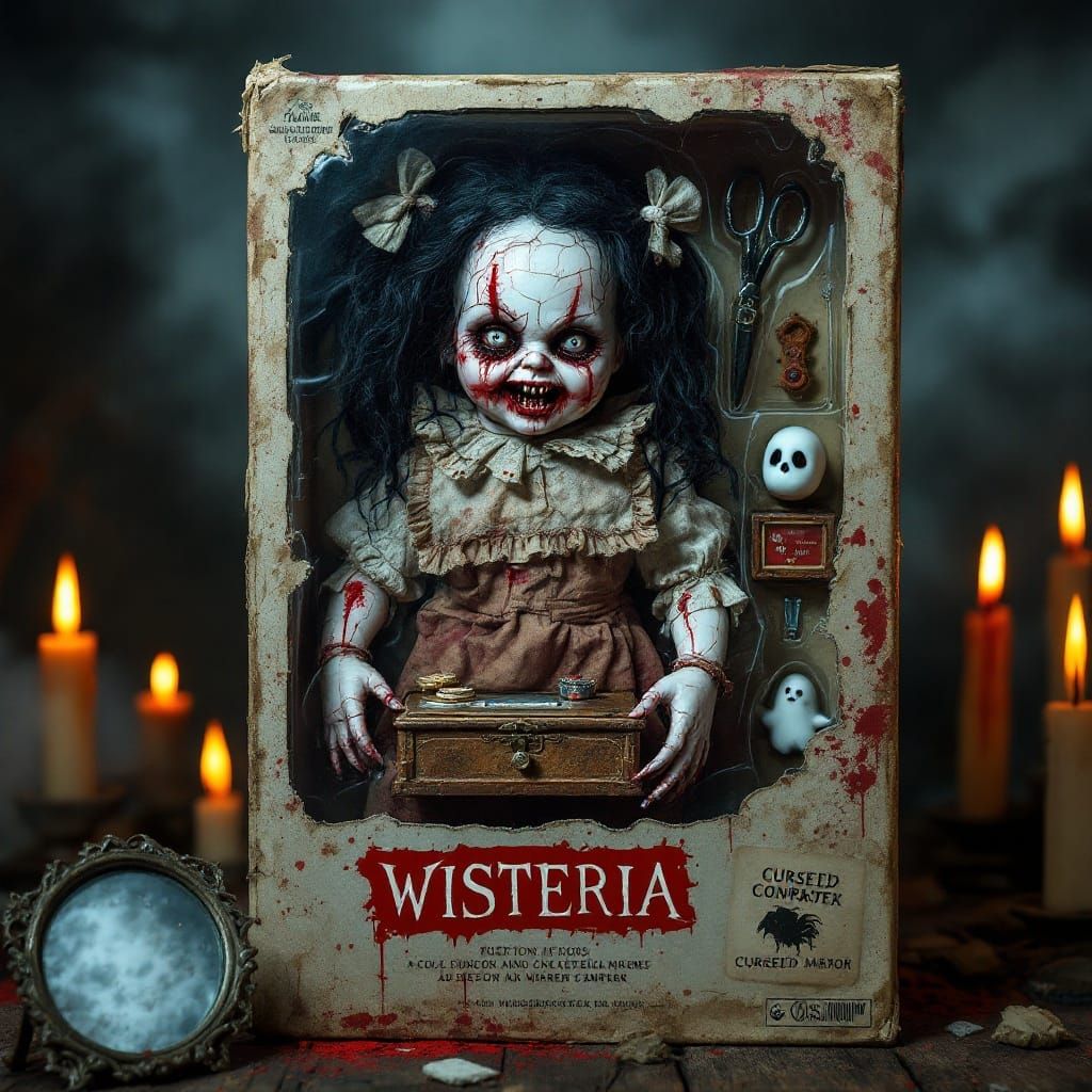 collectible horror action figure in a worn blister-pack toy box, figure is a terrifying doll with cracked porcelain skin, stitched eyes, bleeding mouth full of teeth, tangled black hair with rotting bows, dramatic pose with one hand holding a rusted music box, bold label reads 'Wisteria', accessories ...