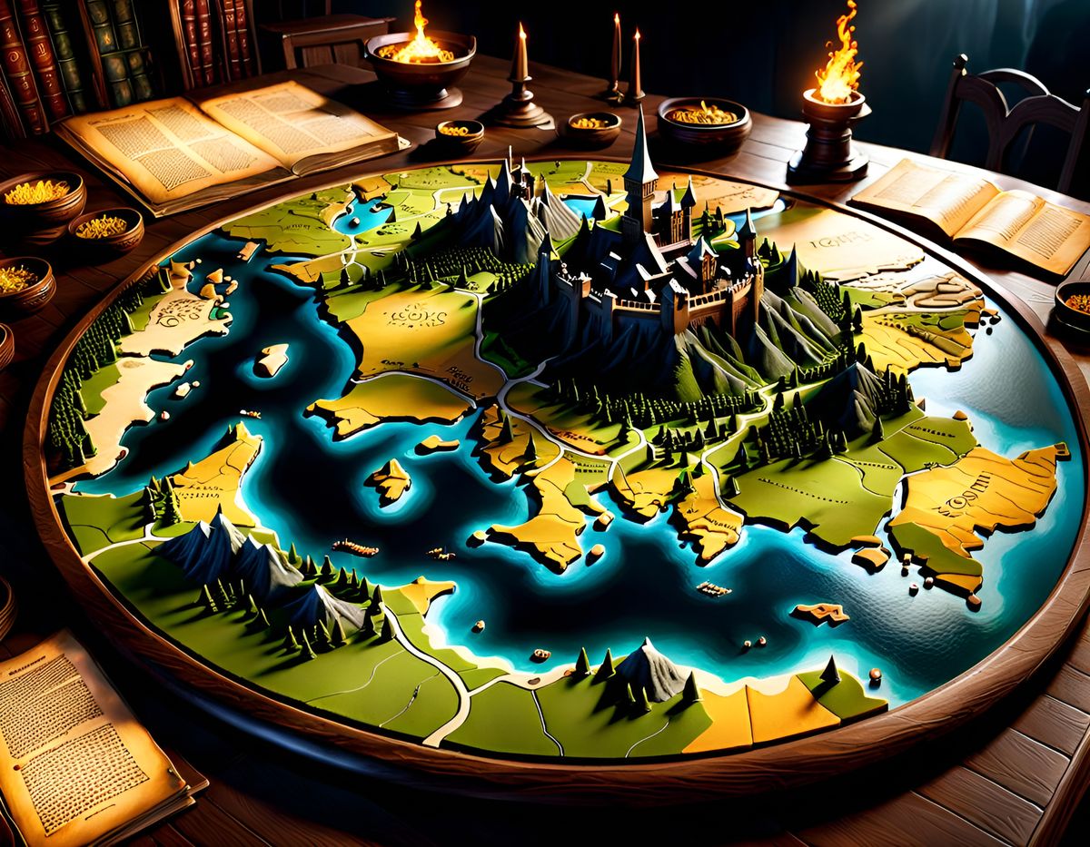 "Lord of The Rings" in perfect letters. Insanely_detailed. "Lord of The Rings". Spectacular RPG game map of a fantasy realm_on a table. Tolkien universe. "Lord of The Rings" Perfect_spelling. 16k resolution. Dramatic Lighting. Cinematic. Perfect_composition. Elaborate_roleplaying map. Spectacular. Masterpiece. ...