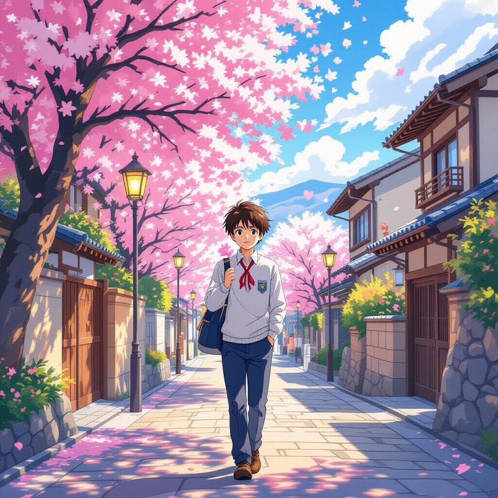 This image depicts a high school boy with a cherry blossom in a Japanese neighborhood. The art style evokes the feeling of anime with golden lighting and realistic details.