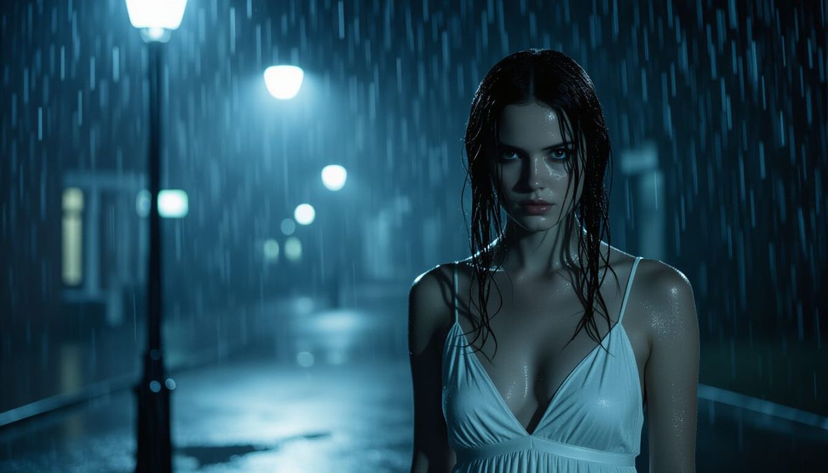 This image shows a woman in a white dress standing under a streetlamp on a dark, rainy street at night. The scene evokes an eerie, romantic horror atmosphere with dramatic lighting.