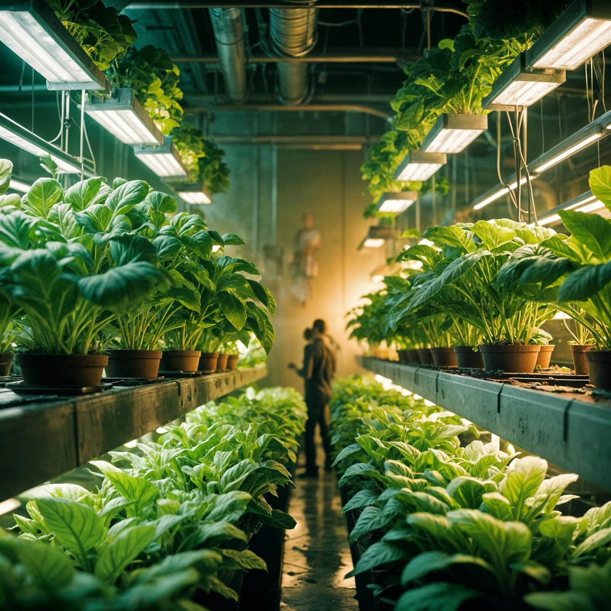 This image shows an underground hydroponic vegetable garden. The scene is rendered with cinematic lighting and film grain, resembling a still from a high-quality film.