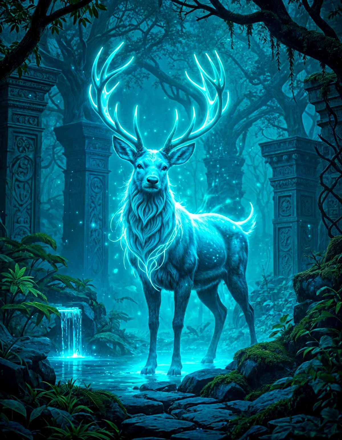 A close-up of a glowing, magical deer in an ancient forest. The image has a high-fantasy realism style, with dynamic action, mystical lighting, bioluminescent flora, and ancient ruins, creating a dreamy, enchanted ambiance.
