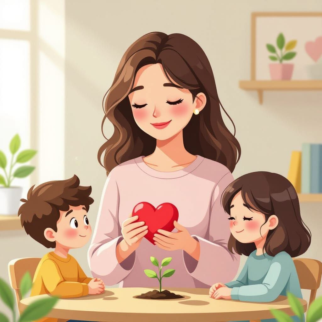 This image shows a kind educator helping various people. The illustration uses pastel colors in a cartoon style to create a hopeful, emotional atmosphere. She is planting a tree and holding a heart.