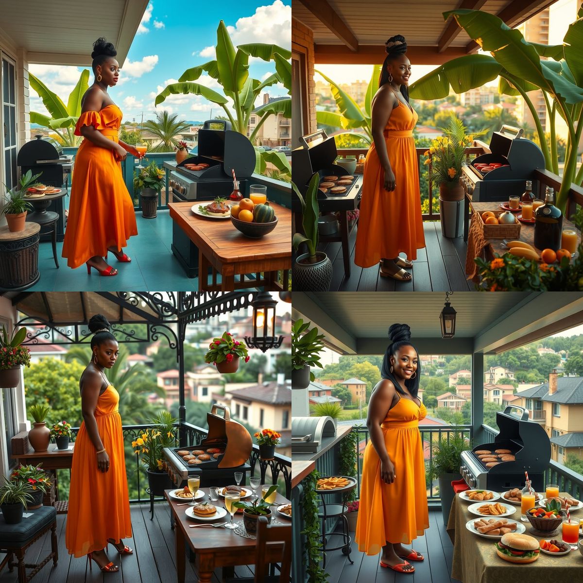 This image shows a plus-size Black woman on a lush balcony overlooking a city. She's grilling burgers in a summer dress and red slippers, with a table laden with food and drinks. The style is reminiscent of glossy oil paintings.
