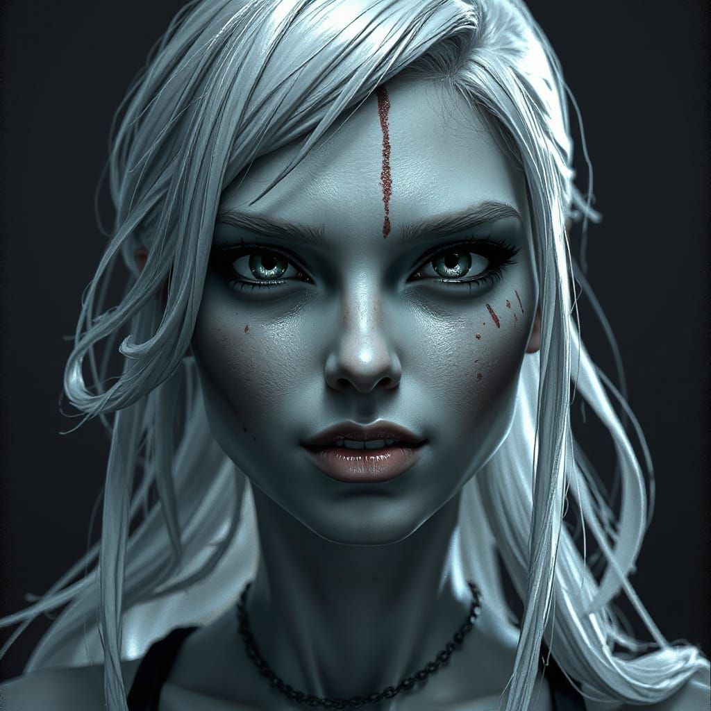 A close-up 3D portrait of a female character with white hair and desaturated skin. The image features bold linework, deep shadows, high contrast, and fine hatching, rendered with textured stylized realism.