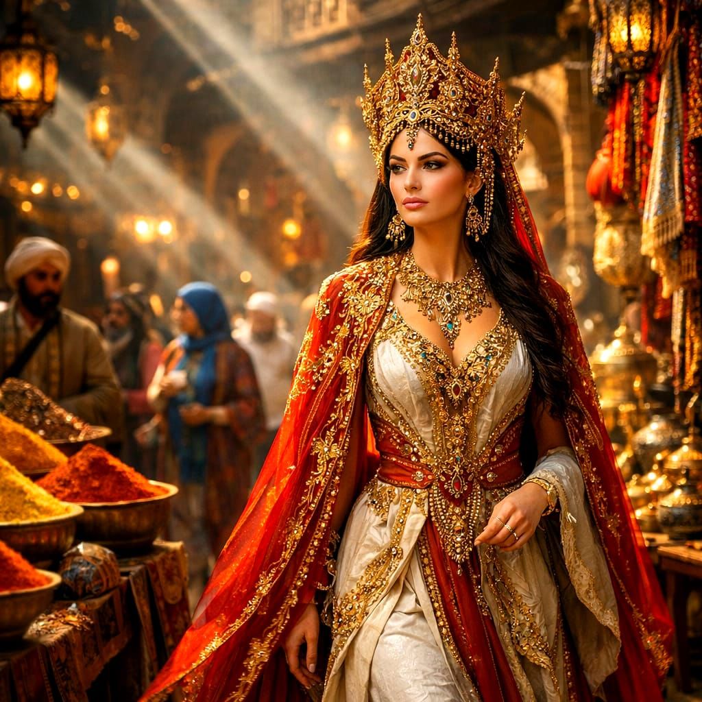 An 8K UHD image using the rule of thirds to place the main subject, using a a Nikon 35mm F.1.8 lens with a deep depth of field, Subjec is a supermodel with elaborate, gilded headdresses and flowing, ...