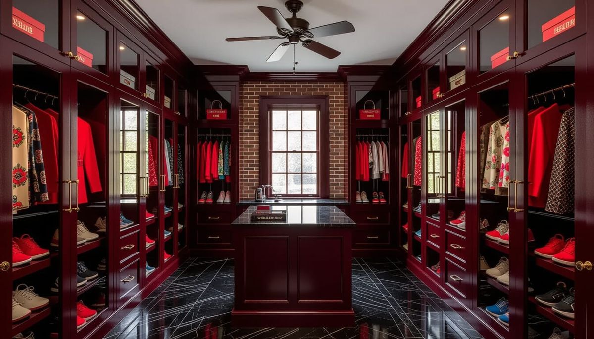 This cinematic image features a charming Victorian walk-in closet with brick wallpaper, black marble floors, and dark red glass cabinets displaying clothing and sneakers. Opulent organization in rich tones.