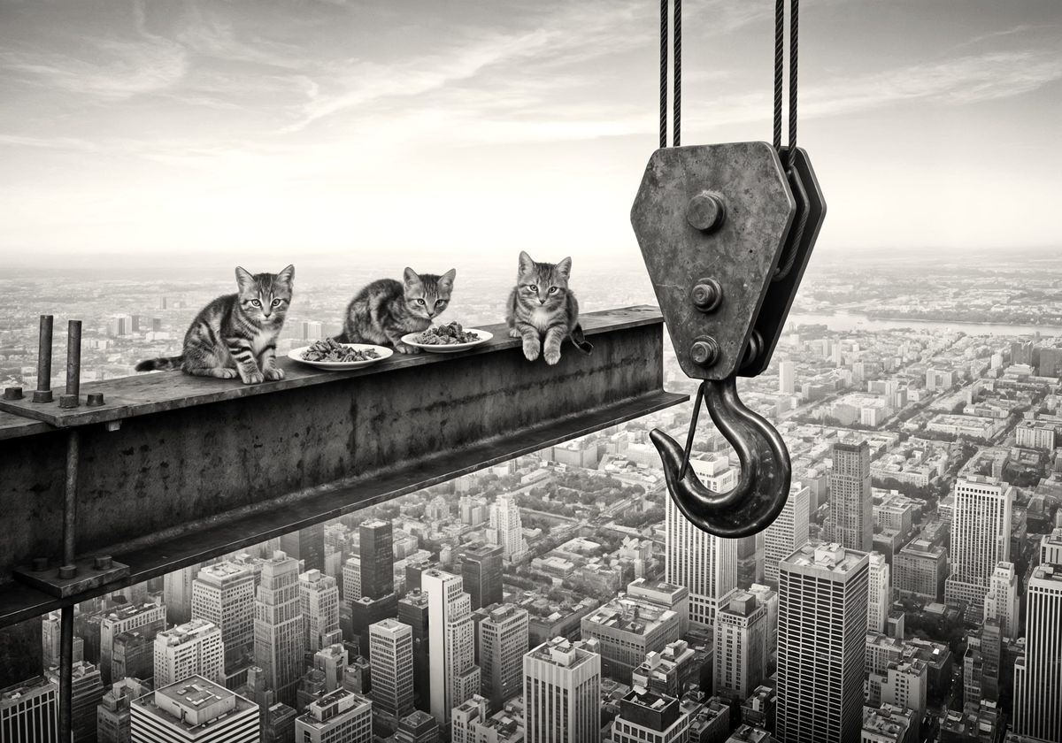 This image shows tabby kittens eating on a construction I-beam high above a sprawling city. Rendered in monochrome with film grain, the image evokes a sense of wonder and contrasts soft fur with a hard industrial scene.