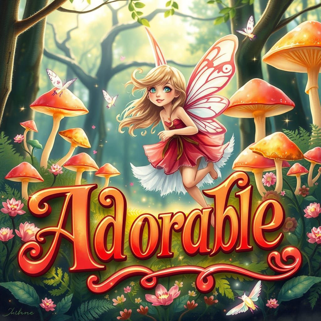 In a sun-dappled, whimsical forest clearing, a delicate, watercolor baby fairy in a pastel crimson fairy dress, with oversized, expressive blue eyes, long flowing curly blonde hair, and a mischievous grin frolics amidst an enchanted fairy garden, surrounded by lush, delicate flora and fauna, including ...