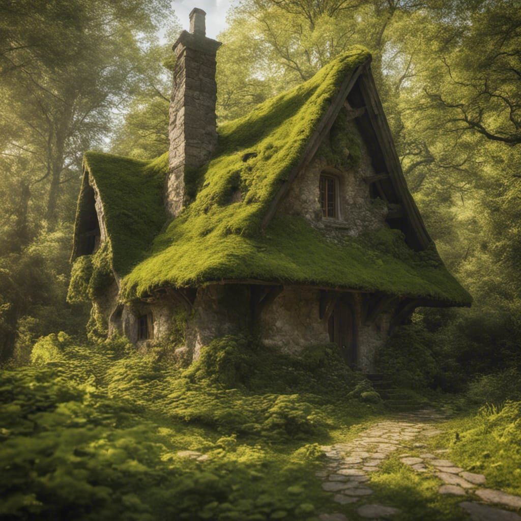 This image shows a quaint medieval cottage nestled in a sunlit forest, overgrown with moss. The scene depicts a clean and idyllic daytime setting.