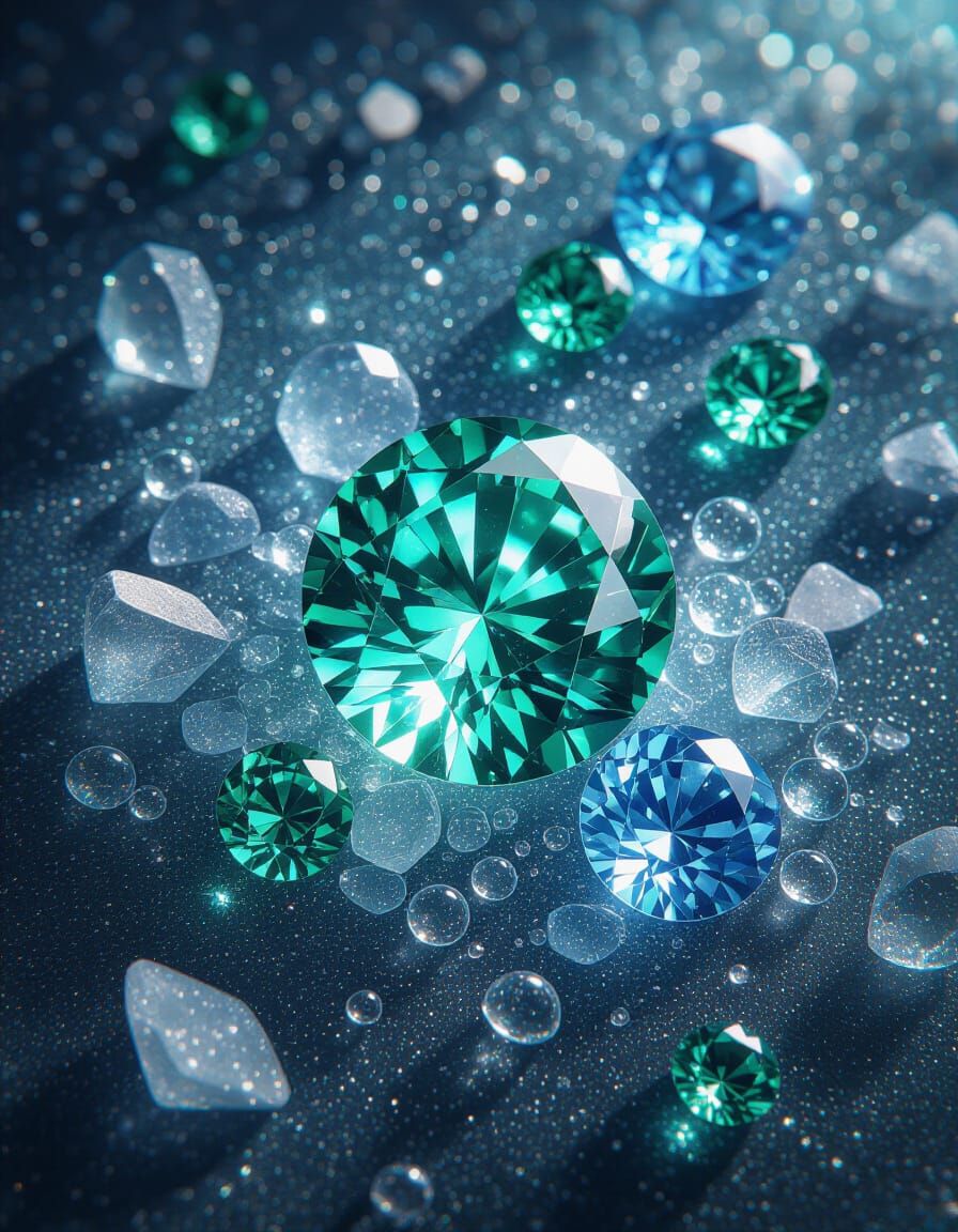 A dazzling display of crushed emerald, sapphire, and aquamarine gems mixed with luminescent bubbles. The image features ornate details and a vibrant, dreamlike aesthetic, reminiscent of art nouveau.