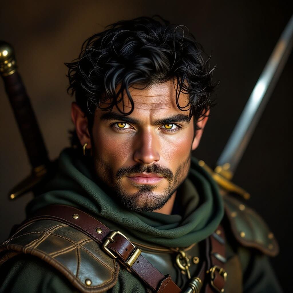 This image shows a male halfling fighter in worn leathers, with twin scimitars. The close-up shot features high contrast, moody shadows, and earthy tones to create a gritty, realistic character portrait.