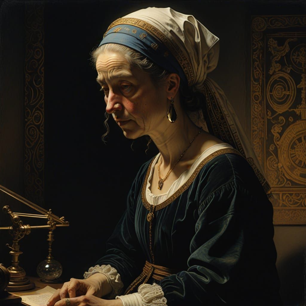 This image depicts an elderly woman's face rendered with dramatic light and shadow, reminiscent of classical Dutch masters, in an astral circuitry aesthetic.