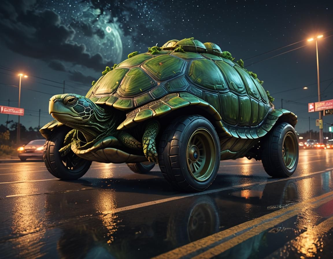A digital painting of a turtle-shaped car moving slowly on a highway at night. The artwork features deep colors and intricate details in a fantasy concept art style.